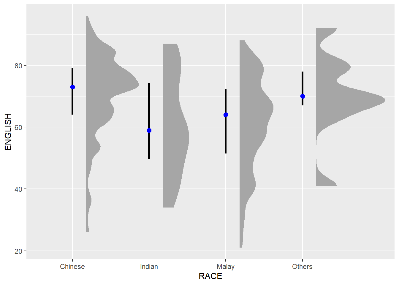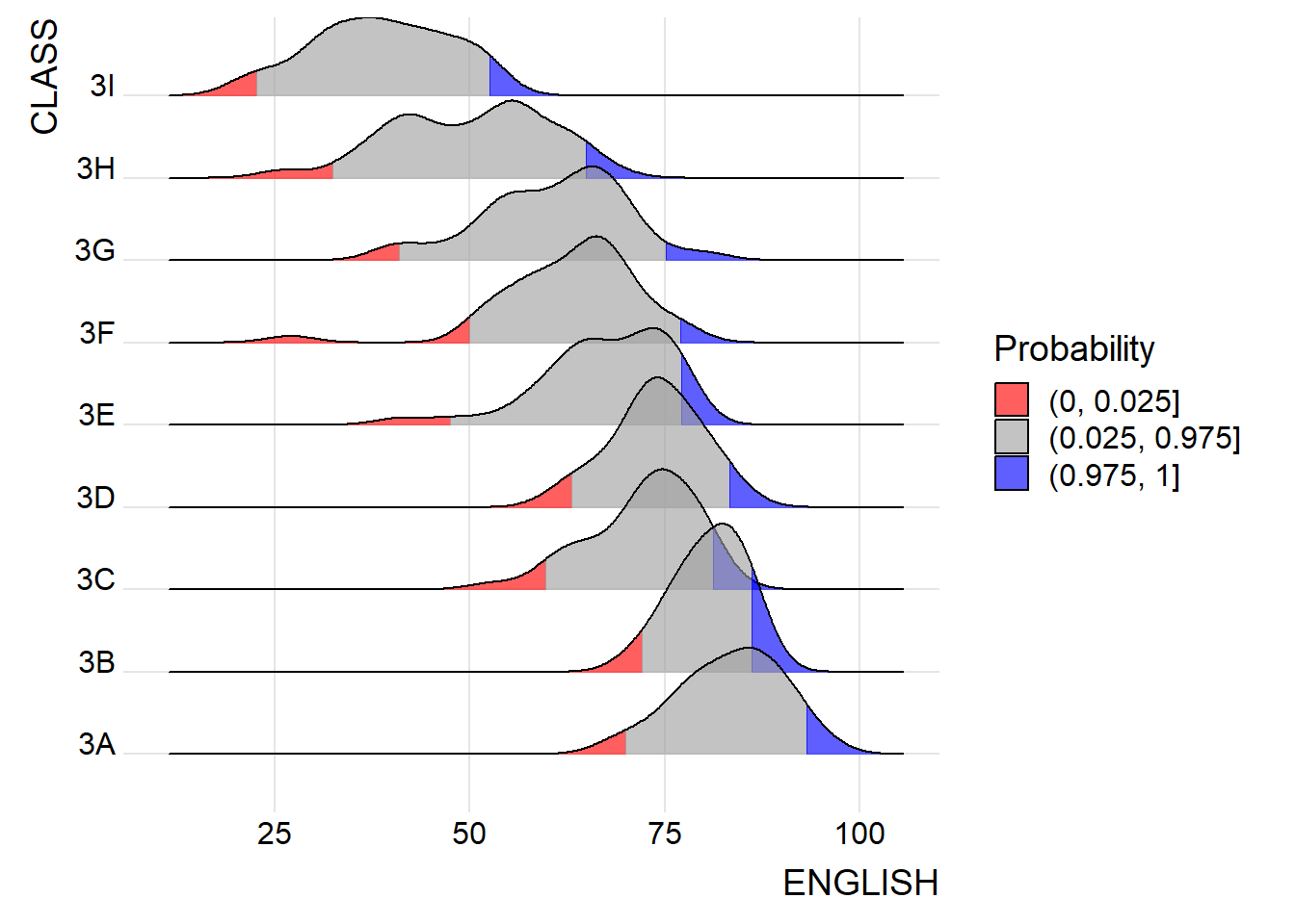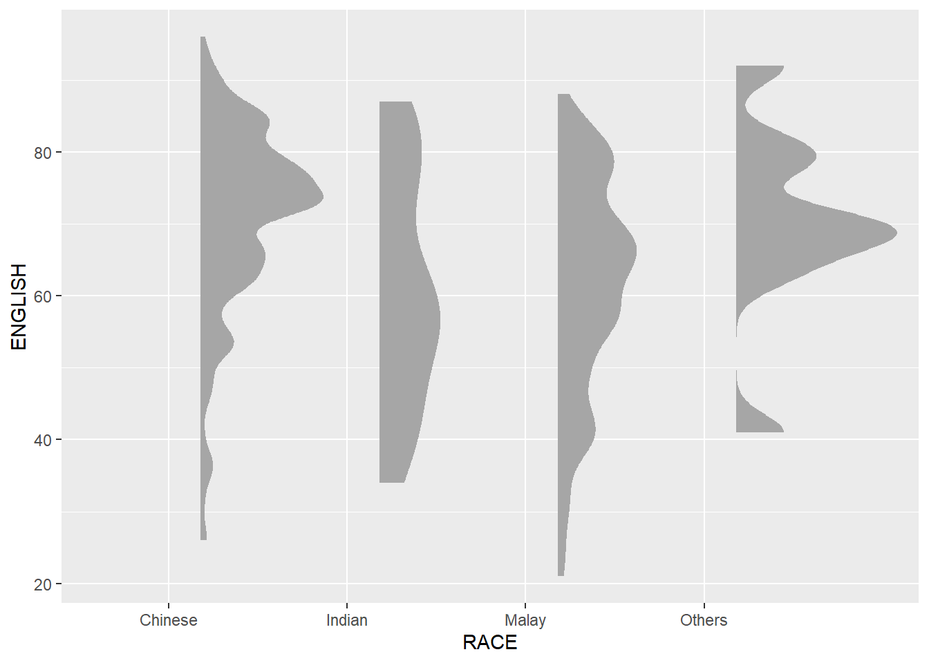 The following code chunk plots the distribution of Primary 3 students’ English scores using geom_density_ridges().