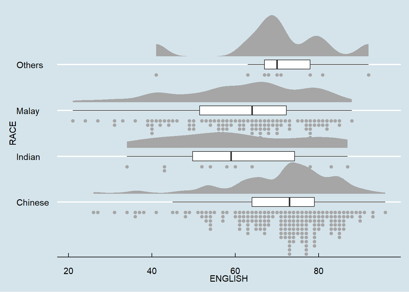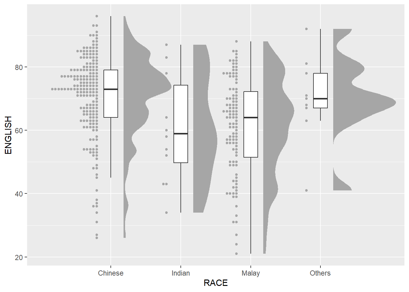 Raincloud Plot is a data visualisation techniques that produces a half-density to a distribution plot. It gets the name because the density plot is in the shape of a “raincloud”. The raincloud (half-density) plot enhances the traditional box-plot by highlighting multiple modalities (an indicator that groups may exist). The boxplot does not show where densities are clustered, but the raincloud plot does!