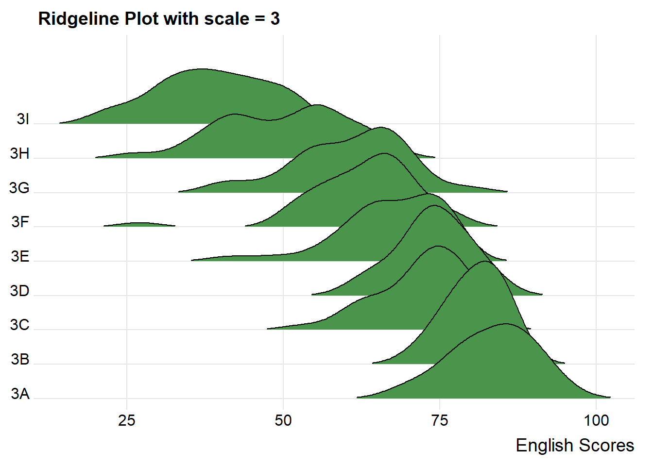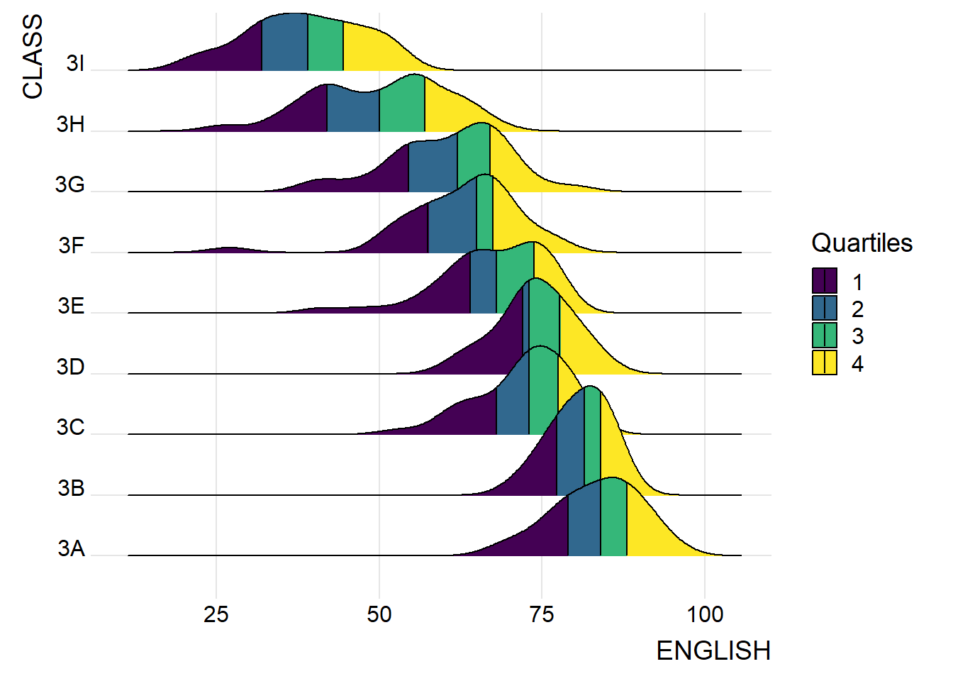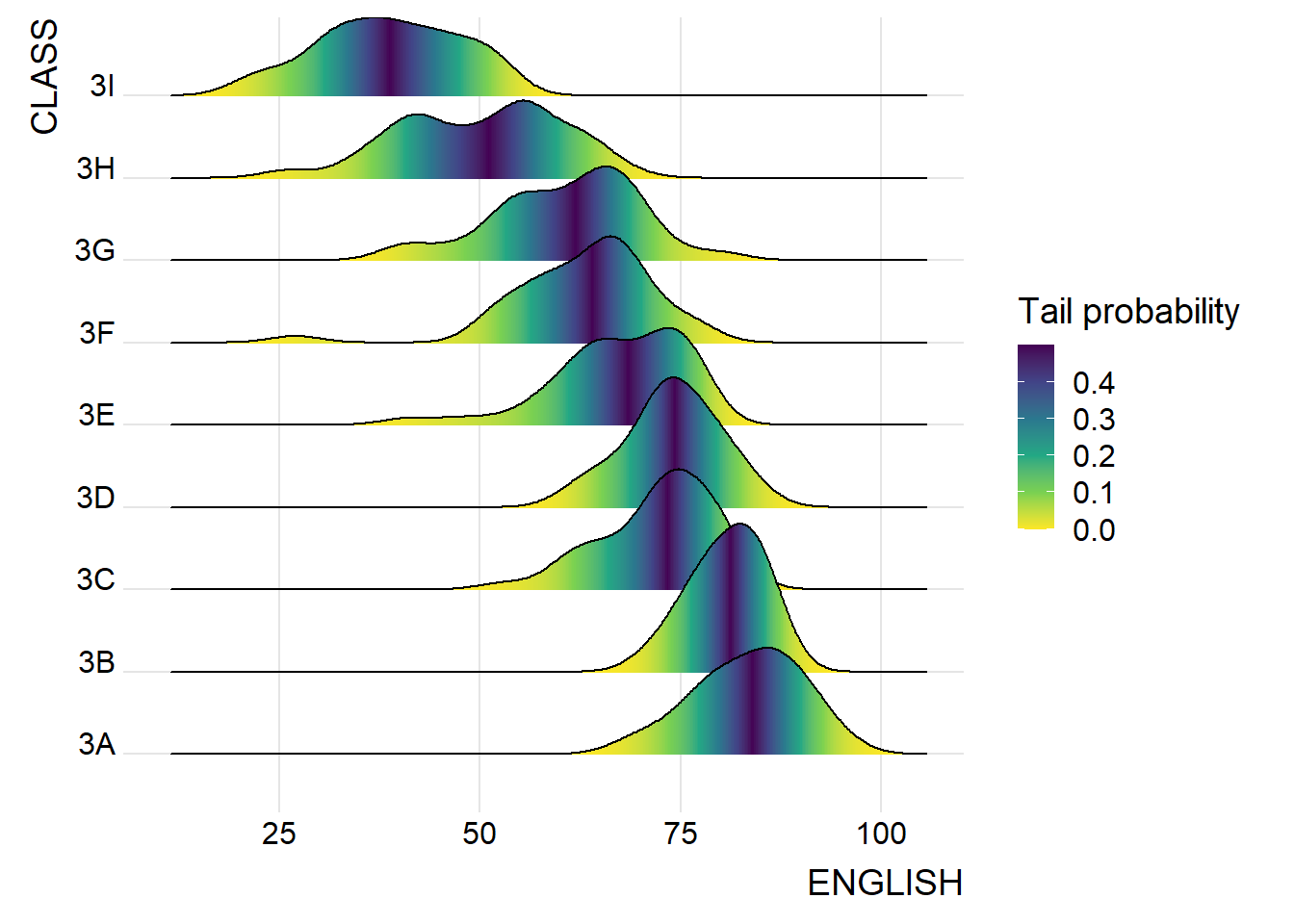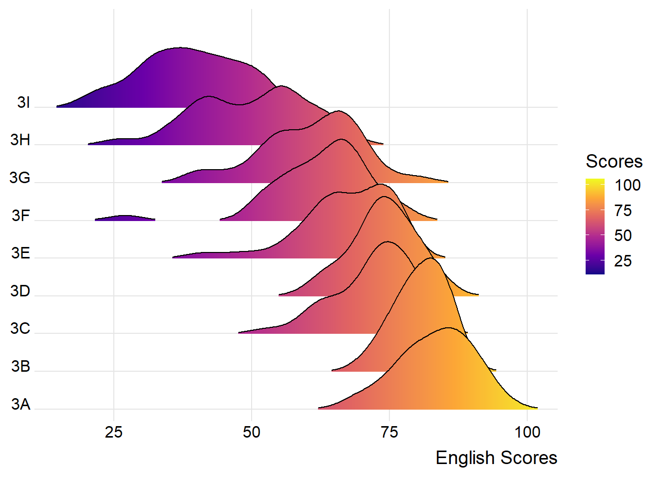 By varying the fill colours, we can visualise how the students’ scores are being distributed. For example, we see that the ridges of class 3A is filled with a lot of yellow, meaning that most of the students had relatively higher scores. In comparison, the ridge for class 3I is filled with a lot of purple, meaning that most of the students had relatively lower scores.