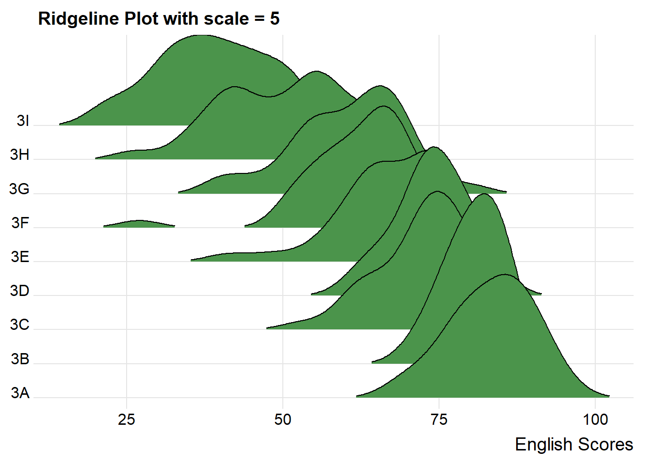 A setting of scale=1 means the tallest density curve just touches the baseline of the next higher one. Smaller values create a separation between the curves, and larger values create more overlap.