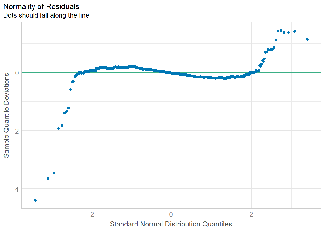 We use check_normality() of performance package to check if the model follows the normality assumption.
