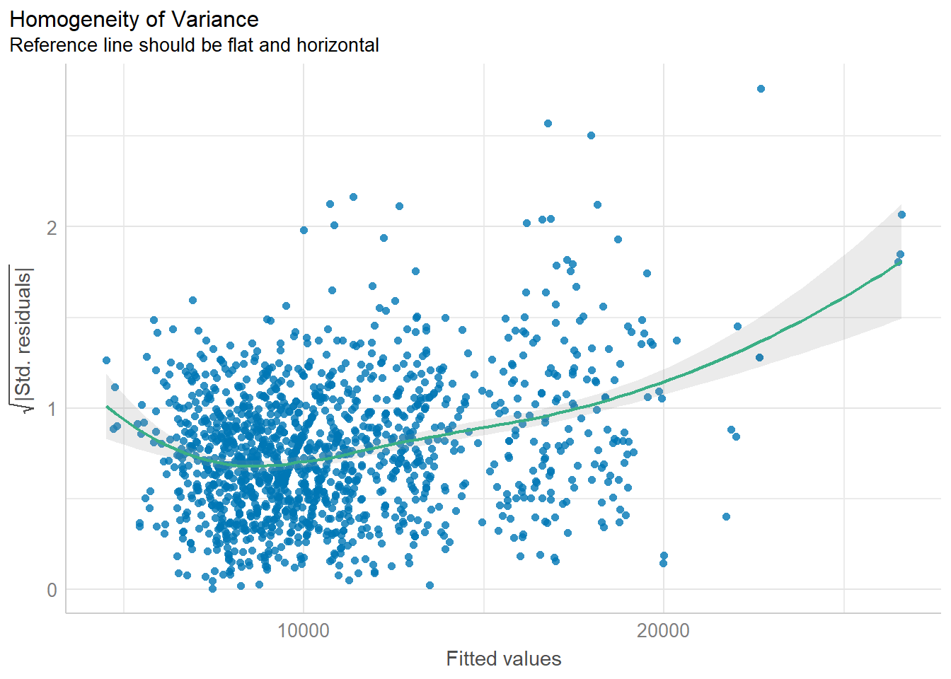 We check for homogeneity of Variances using check_heterscedasticity of performance package.