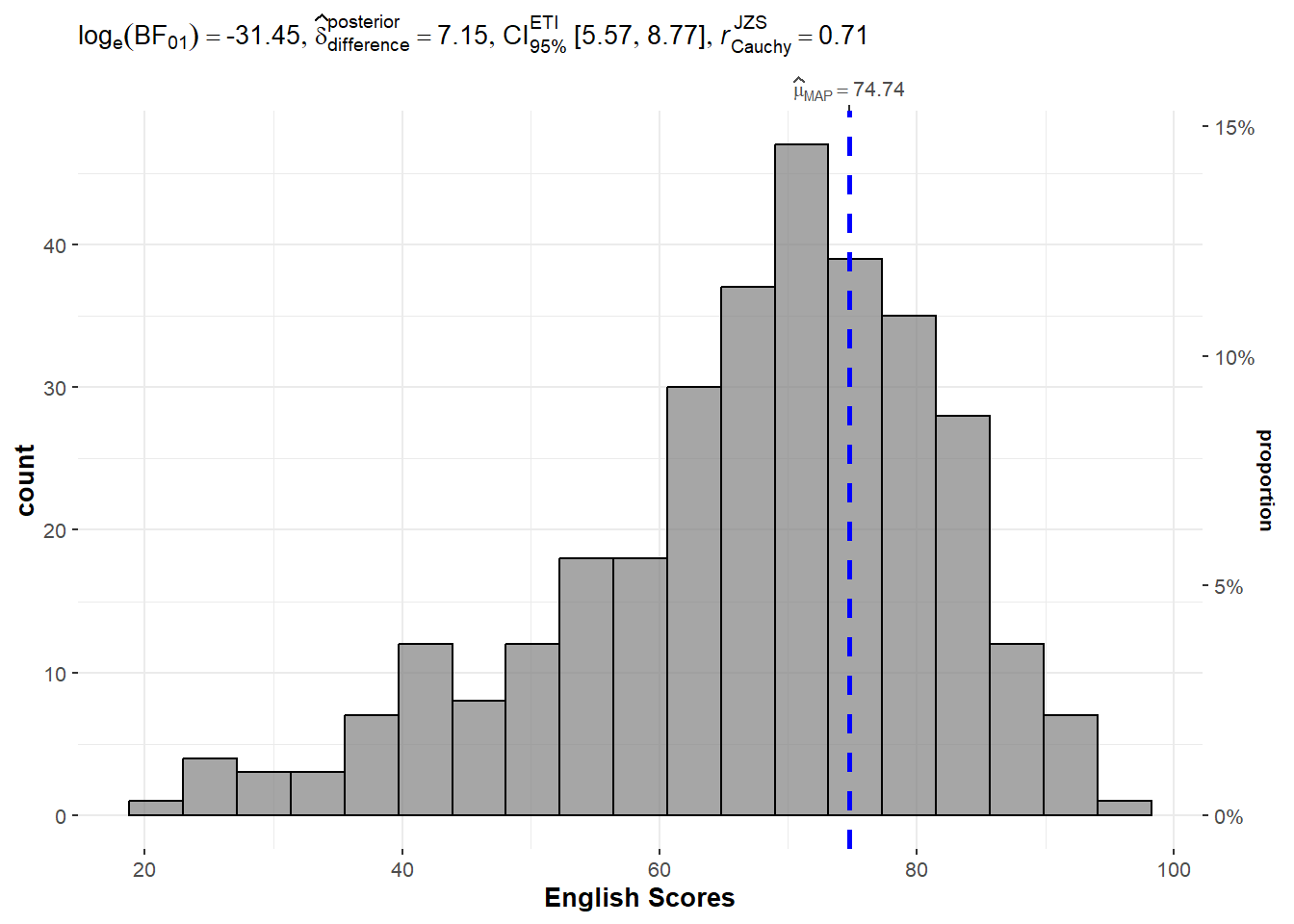 We can use gghistostats() to build an visual of one-sample test on English Scores.