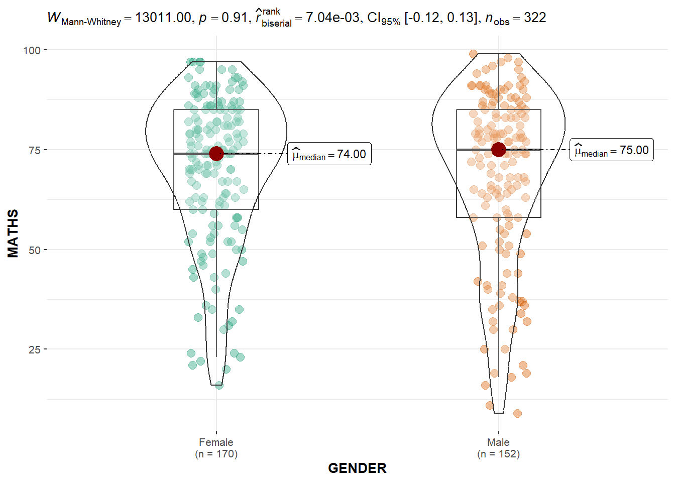 We can use ggbetweenstats() to build an visual of two sample means test of math scores by gender.