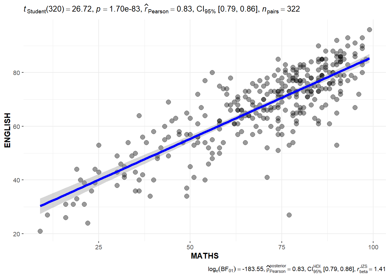 We can use ggscatterstats() to build a visual for significant test of correlation between Math Scores and English Scores.