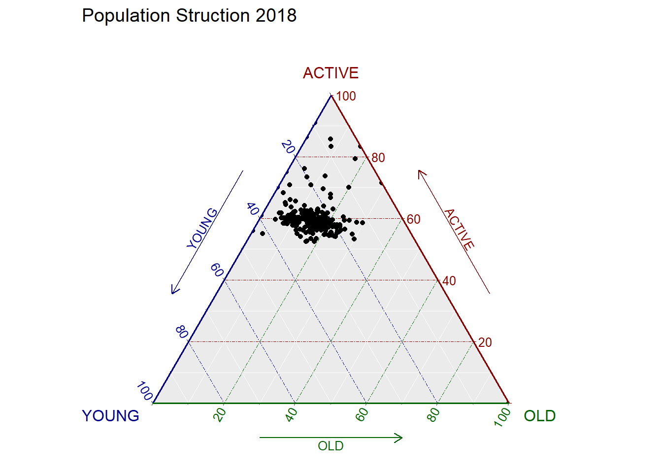 Ternary plots are a way of displaying the distribution and variability of three-part compositional data. For example, in this exercise, we will have proportions of population: (1) aged, (2) economy active and (3) young. The plot is displayed in a triangle with sides scaled from 0 to 1. Each side represents one of the three components. A point is plotted so that a line drawn perpendicular from the point to each leg of the triangle intersect at the component values of the point.